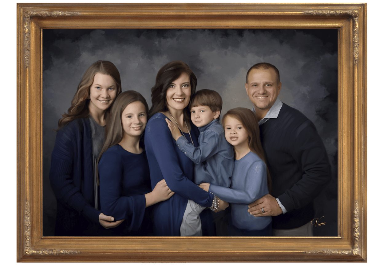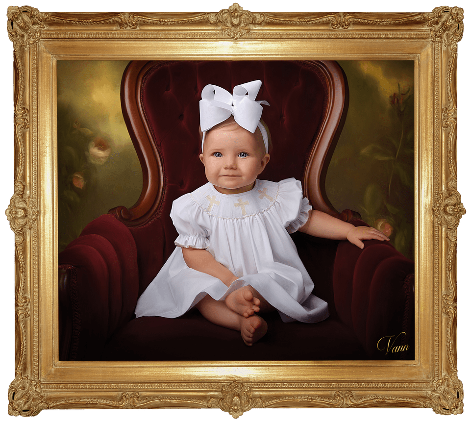 The Masterpiece Portrait is the most exquisite offer from Vann Fine Art Portraits and is our most exclusive. We have perfected a form of painting with the realism of a photograph. This intricate process involves tremendous attention to detail, adding hand brush strokes, color, and highlights in the style of traditional master painters. Each art piece begins as a classic photograph where true to life expressions can be captured and is enhanced with our unique hand-applied artistic touches, resulting in timeless portraits indistinguishable from oil paintings. Each Masterpiece Portrait is truly one of kind and will remain beautiful for centuries.
